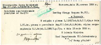 | Abstract | Prośba o nadesłanie rozporządzenia M.S.Wojsk.L.1280/K.p.Tjn z 12 maja 1926. |